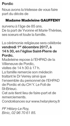 Décédée à Saint-Brieuc (22000, France) le mardi 28 novembre 2017 à l'âge de 85 ans