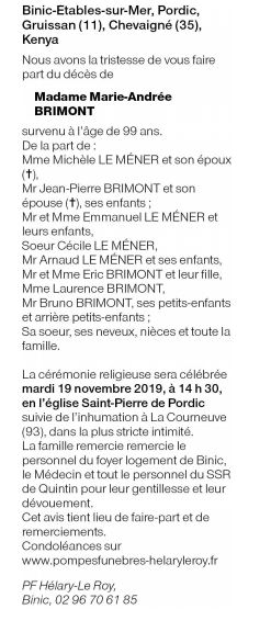 Décédée à Quintin (22800, France) le jeudi 14 novembre 2019 à l'âge de 99 ans