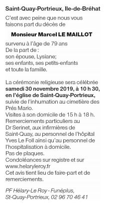 Décédé à Saint-Quay-Portrieux (22410, France) le mardi 26 novembre 2019 à l'âge de 79 ans