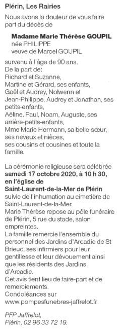 Décédée à Saint-Brieuc (22000, France) le jeudi 15 octobre 2020 à l'âge de 90 ans