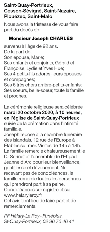 Décédé à Saint-Quay-Portrieux (22410, France) le jeudi 15 octobre 2020 à l'âge de 92 ans