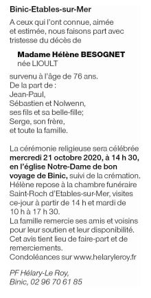 Décédée à Saint-Brieuc (22000, France) le samedi 17 octobre 2020 à l'âge de 76 ans