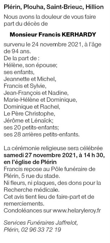 Décédé à Saint-Brieuc (22000, France) le mercredi 24 novembre 2021 à l'âge de 94 ans
