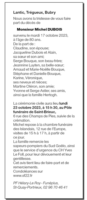 Décédé à Saint-Brieuc (22000, France) le mardi 17 octobre 2023 à l'âge de 80 ans