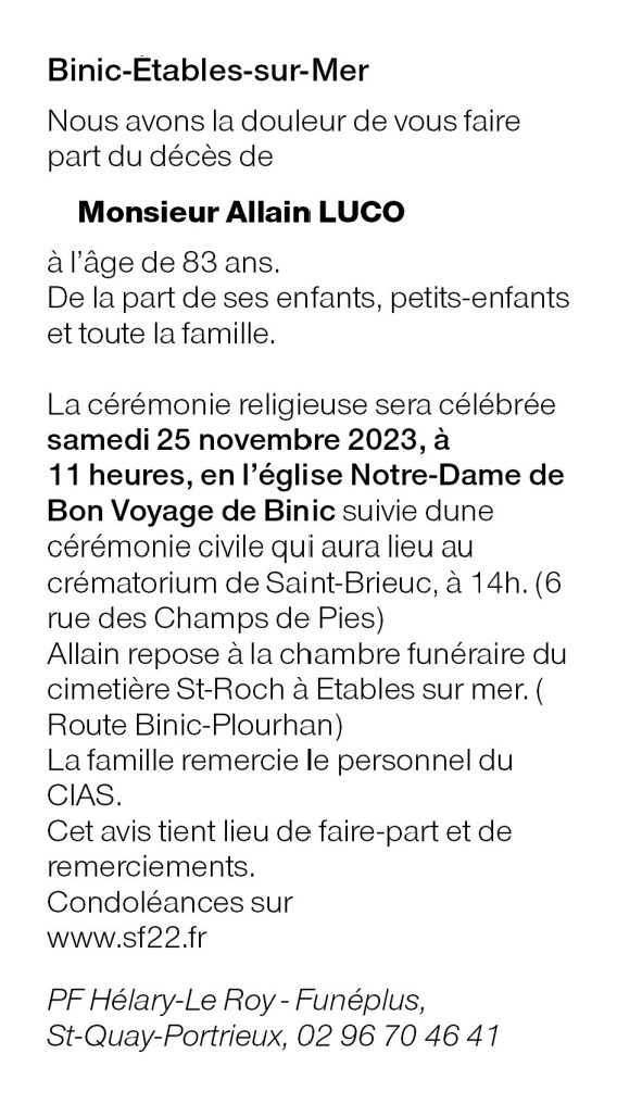 Décédé à Binic (22520, France) le samedi 18 novembre 2023 à l'âge de 83 ans