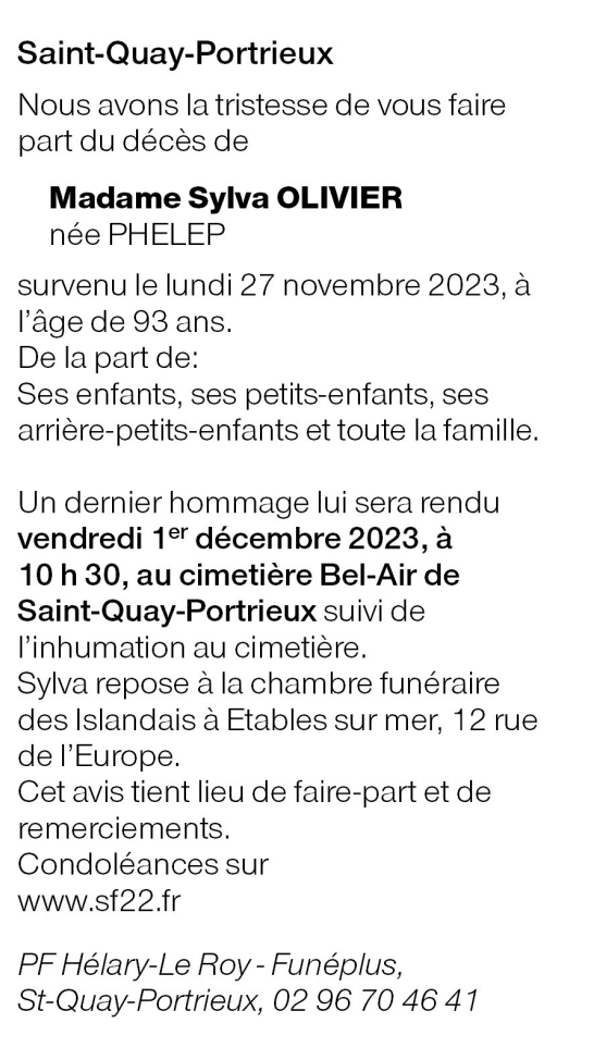 Décédée à Saint-Quay-Portrieux (22410, France) le lundi 27 novembre 2023 à l'âge de 93 ans