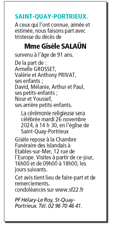 Décédée à Saint-Quay-Portrieux (22410, France) le jeudi 21 novembre 2024 à l'âge de 91 ans