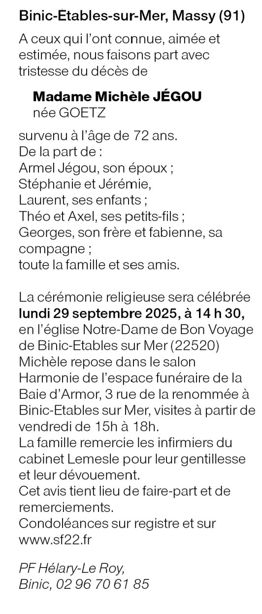 Décédée à Binic (22520, France) le mardi 23 septembre 2025 à l'âge de 72 ans