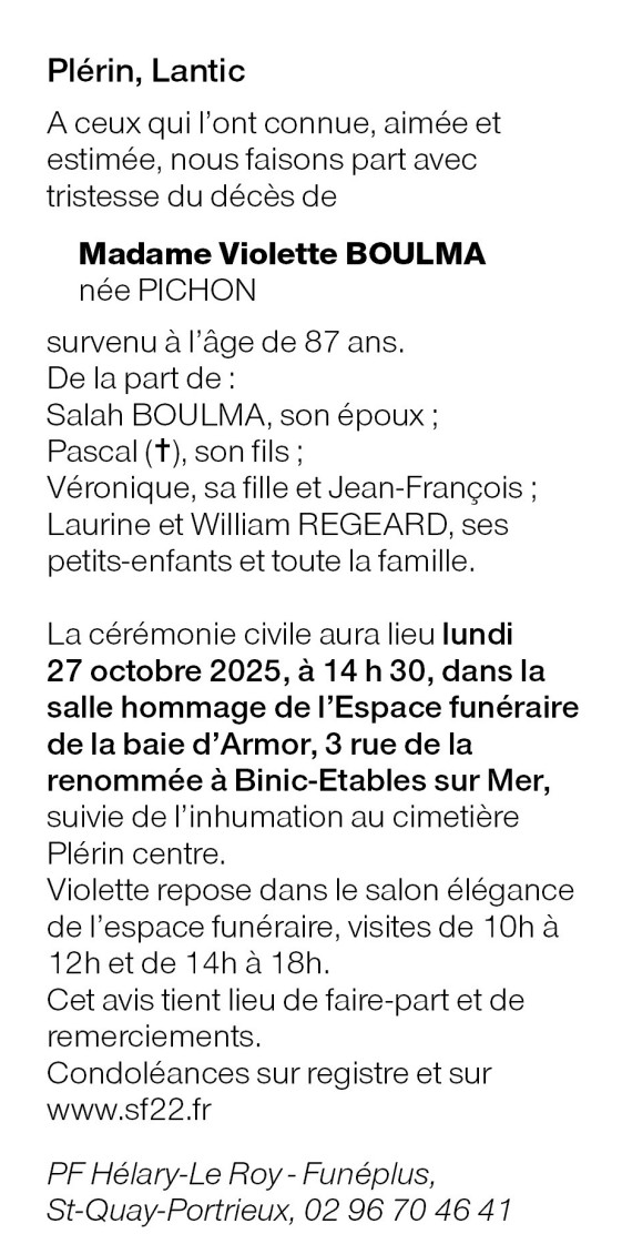 Décédée à Plérin (22190, France) le jeudi 23 octobre 2025 à l'âge de 87 ans
