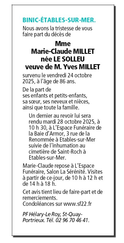Décédée à Binic-Étables-sur-Mer (22680, France) le vendredi 24 octobre 2025 à l'âge de 86 ans