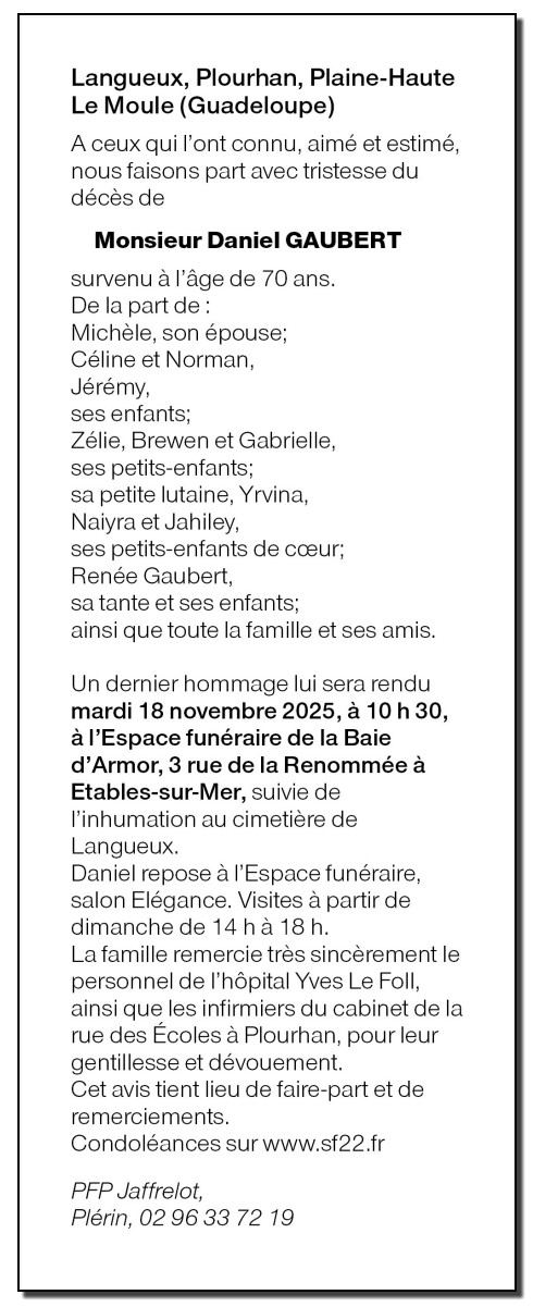 Décédé à Saint-Brieuc (22000, France) le jeudi 13 novembre 2025 à l'âge de 70 ans