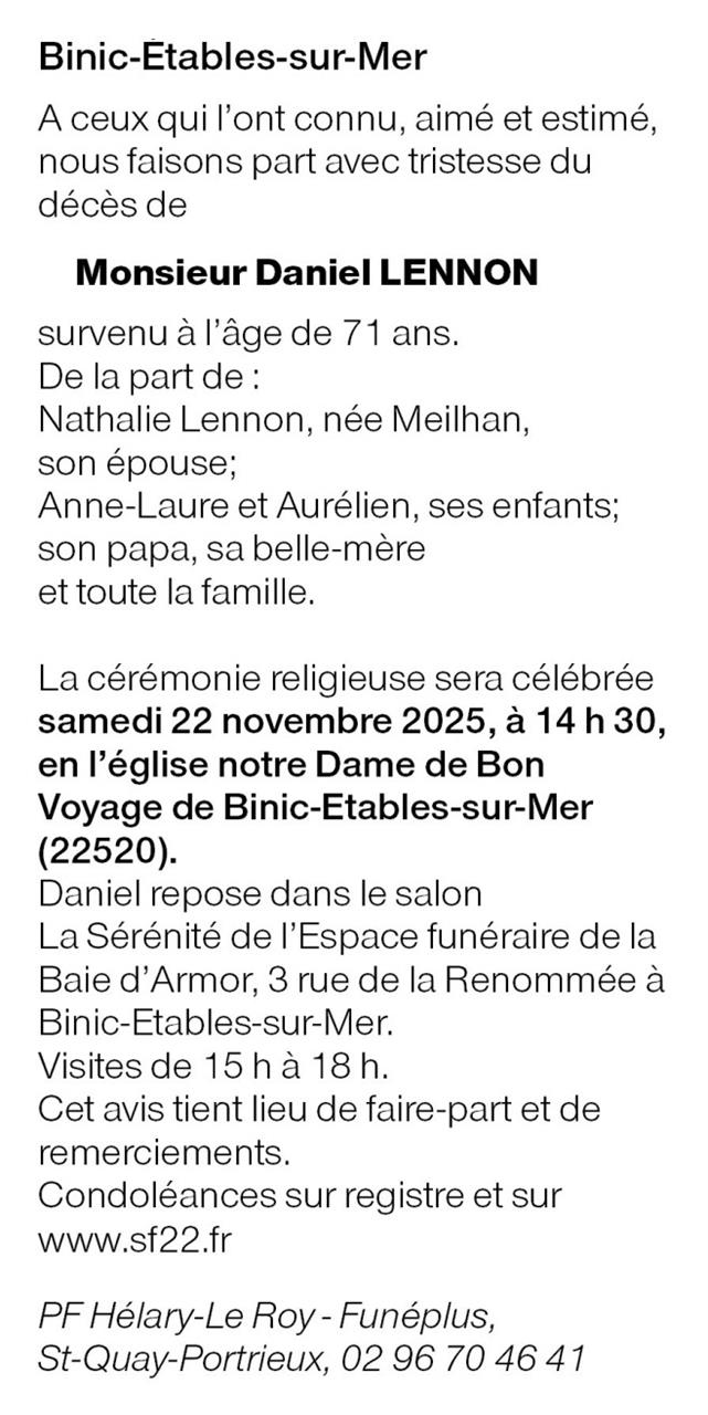 Décédé à Binic (22520, France) le lundi 17 novembre 2025 à l'âge de 71 ans