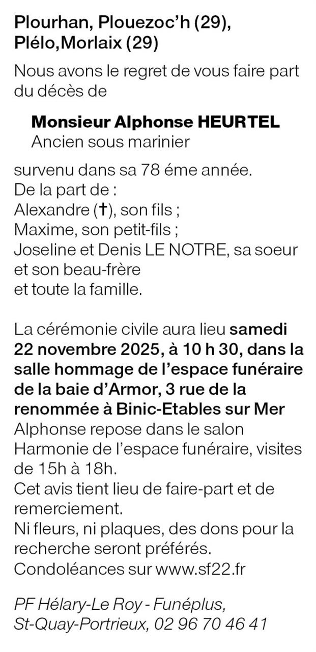Décédé à Saint-Brieuc (22000, France) le mardi 18 novembre 2025 à l'âge de 77 ans