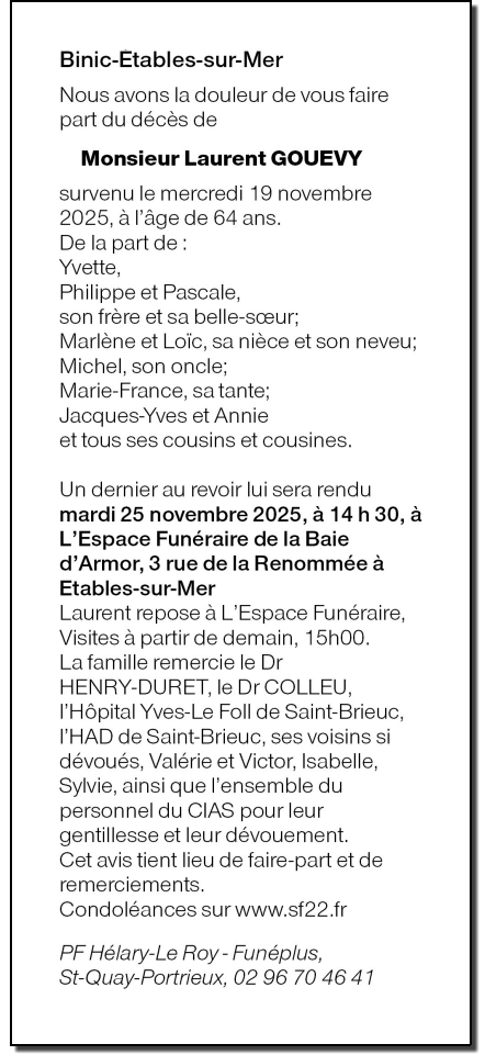 Décédé à Saint-Brieuc (22000, France) le mercredi 19 novembre 2025 à l'âge de 64 ans