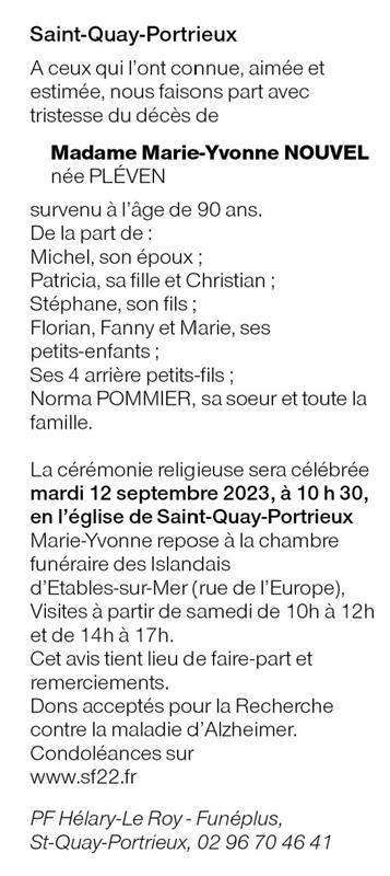 Décédée à Saint-Quay-Portrieux (22410, France) le jeudi 7 septembre 2023 à l'âge de 90 ans