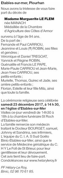 Décédée à Saint-Brieuc (22000, France) le mercredi 20 décembre 2017 à l'âge de 94 ans