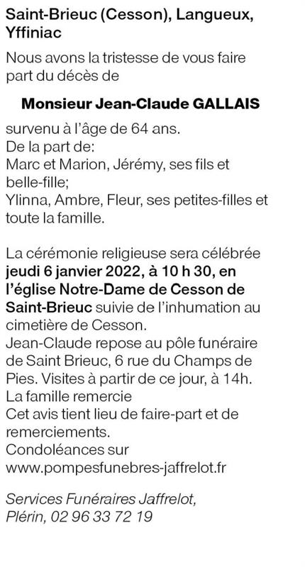 Décédé à Saint-Brieuc (22000, France) le samedi 1 janvier 2022 à l'âge de 64 ans