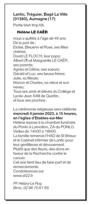 Décédée à Pabu (22200, France) le samedi 31 décembre 2022 à l'âge de 49 ans