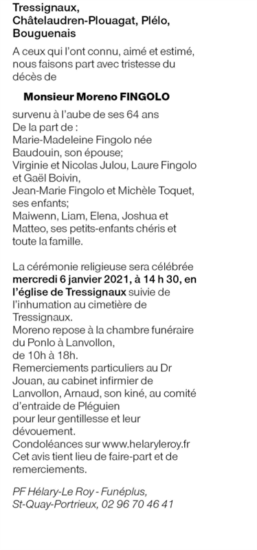 Décédé à Tressignaux (22290, France) le jeudi 31 décembre 2020 à l'âge de 63 ans