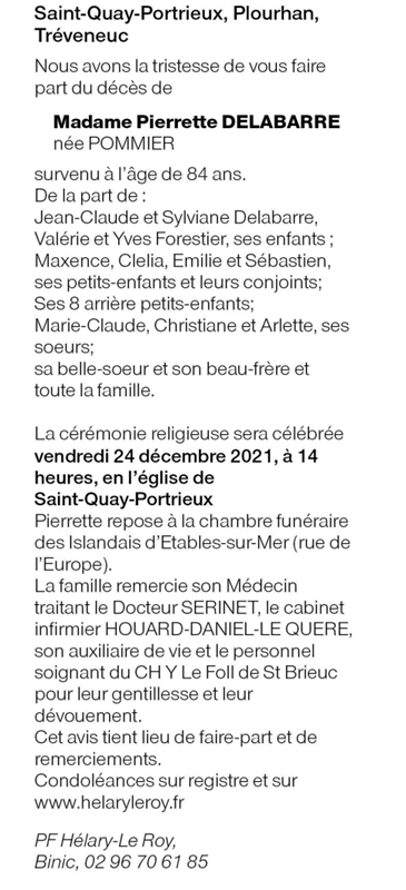 Décédée à Saint-Brieuc (22000, France) le mardi 21 décembre 2021 à l'âge de 84 ans