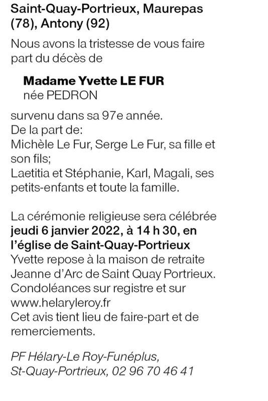 Décédée à Saint-Quay-Portrieux (22410, France) le vendredi 31 décembre 2021 à l'âge de 96 ans