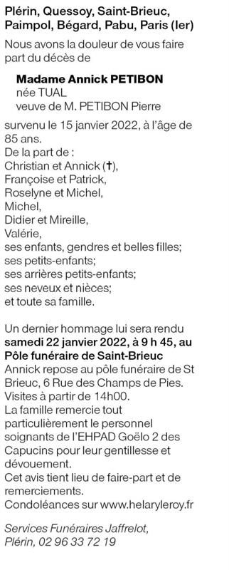 Décédée à Saint-Brieuc (22000, France) le samedi 15 janvier 2022 à l'âge de 85 ans
