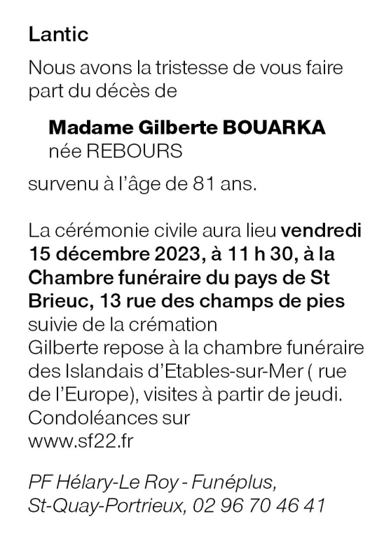 Décédée à Saint-Brieuc (22000, France) le mardi 12 décembre 2023 à l'âge de 81 ans