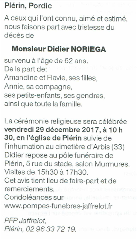 Décédé à Plérin (22190, France) le mardi 26 décembre 2017 à l'âge de 62 ans