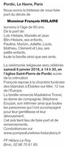 Décédé à Pordic (22590, France) le dimanche 31 décembre 2017 à l'âge de 90 ans