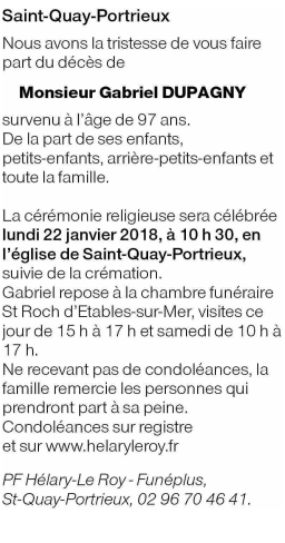 Décédé à Saint-Quay-Portrieux (22410, France) le mercredi 17 janvier 2018 à l'âge de 97 ans