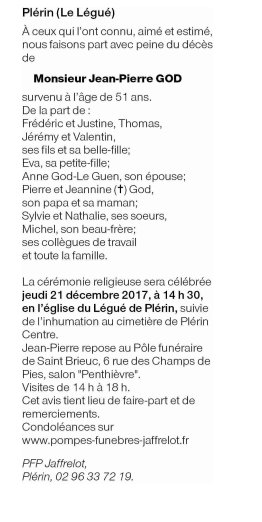 Décédé à Plérin (22190, France) le dimanche 17 décembre 2017 à l'âge de 51 ans
