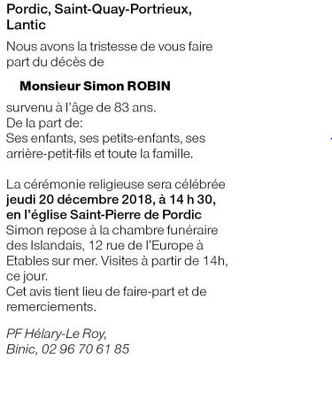 Décédé à Saint-Brieuc (22000, France) le lundi 17 décembre 2018 à l'âge de 83 ans
