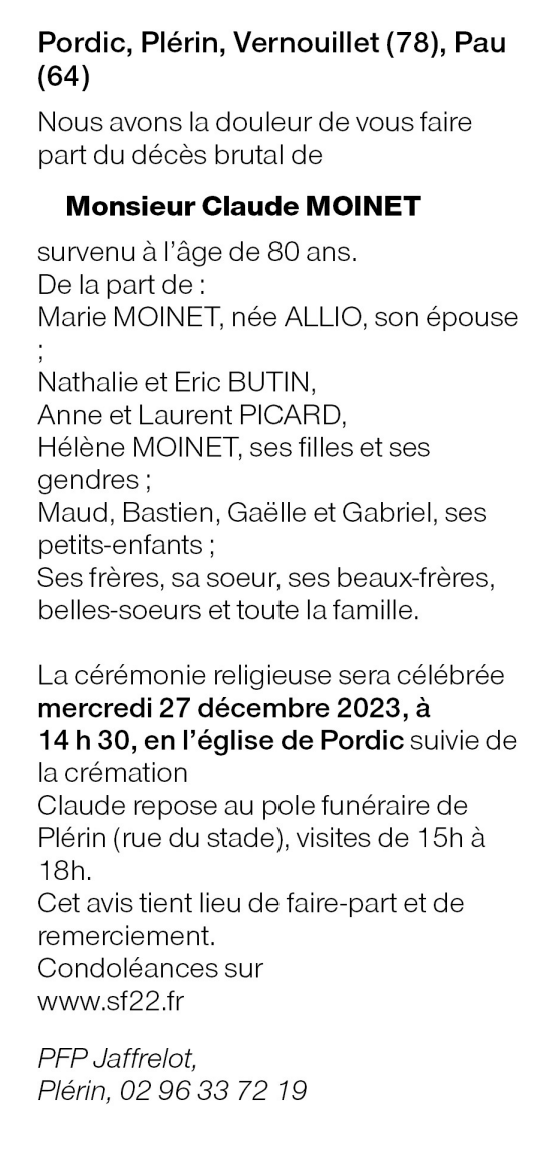 Décédé à Pordic (22590, France) le samedi 23 décembre 2023 à l'âge de 80 ans