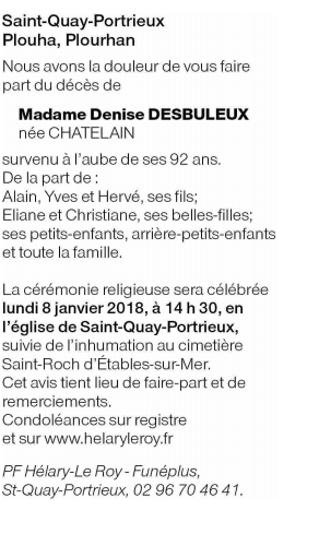 Décédée à Saint-Quay-Portrieux (22410, France) le vendredi 5 janvier 2018 à l'âge de 91 ans