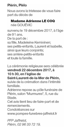 Décédée à Saint-Brieuc (22000, France) le mardi 19 décembre 2017 à l'âge de 91 ans