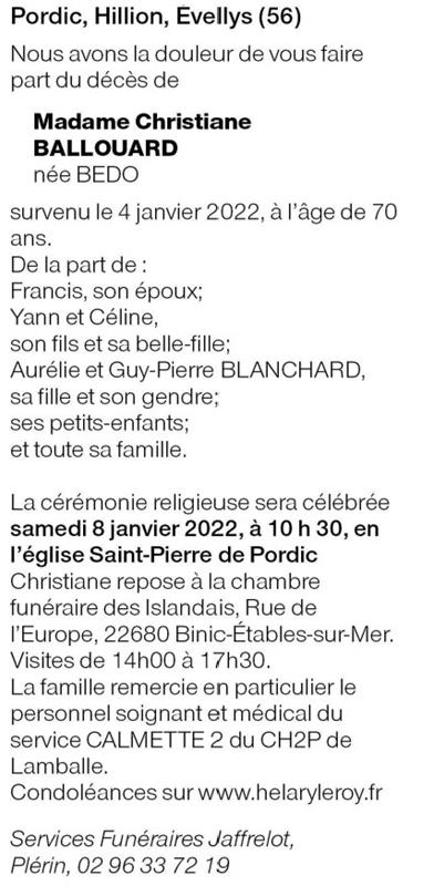 Décédée à Lamballe (22400, France) le mardi 4 janvier 2022 à l'âge de 70 ans