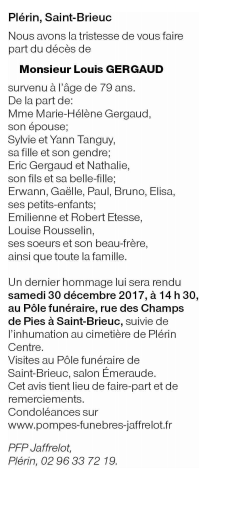 Décédé à Plérin (22190, France) le mercredi 27 décembre 2017 à l'âge de 79 ans