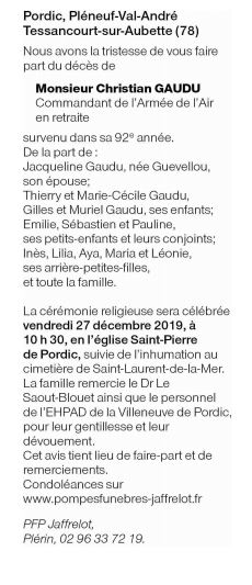 Décédé à Saint-Brieuc (22000, France) le dimanche 22 décembre 2019 à l'âge de 91 ans