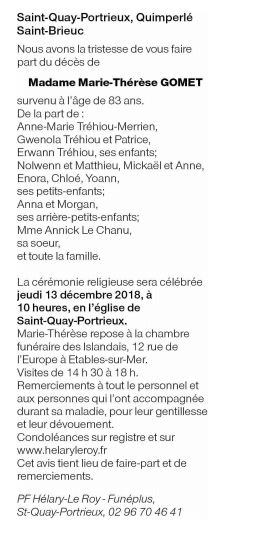 Décédée à Saint-Brieuc (22000, France) le dimanche 9 décembre 2018 à l'âge de 83 ans