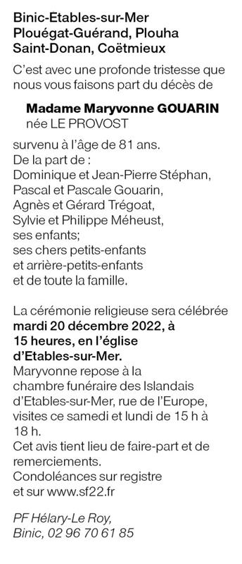 Décédée à Saint-Brieuc (22000, France) le vendredi 16 décembre 2022 à l'âge de 81 ans