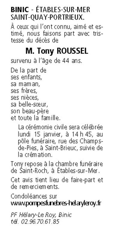 Décédé à Binic-Étables-sur-Mer (22680, France) le lundi 8 janvier 2018 à l'âge de 44 ans
