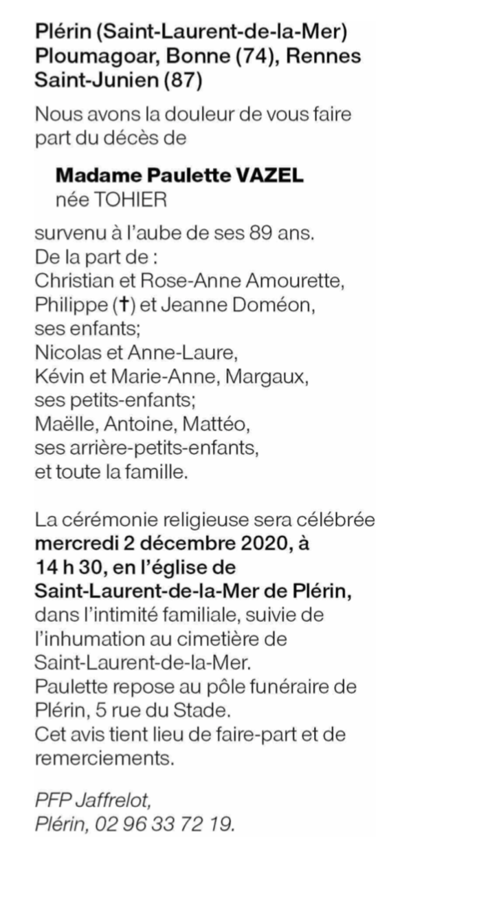 Décédée à Saint Laurent de la Mer (22190, France) le dimanche 29 novembre 2020 à l'âge de 88 ans