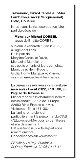 Décédé à Binic-Étables-sur-Mer (22680, France) le vendredi 19 août 2022 à l'âge de 83 ans