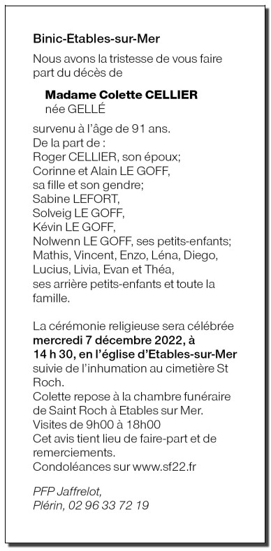 Décédée à Saint-Brieuc (22000, France) le vendredi 2 décembre 2022 à l'âge de 91 ans