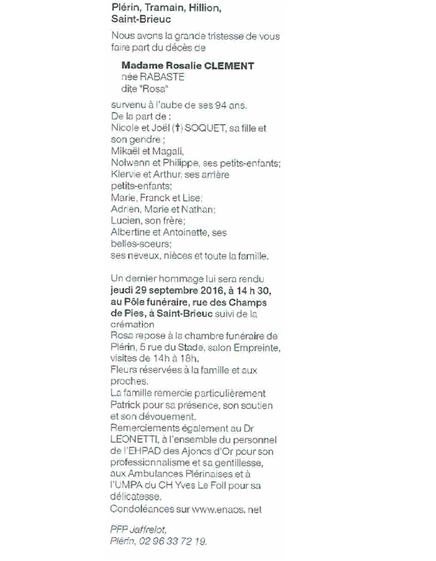 Décédée à Saint-Brieuc (22000, France) le lundi 26 septembre 2016 à l'âge de 93 ans
