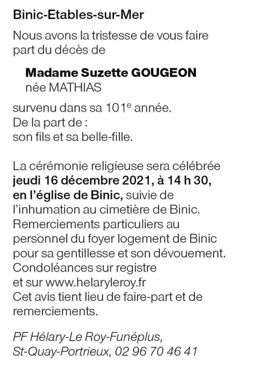 Décédée à Binic (22520, France) le mardi 14 décembre 2021 à l'âge de 100 ans